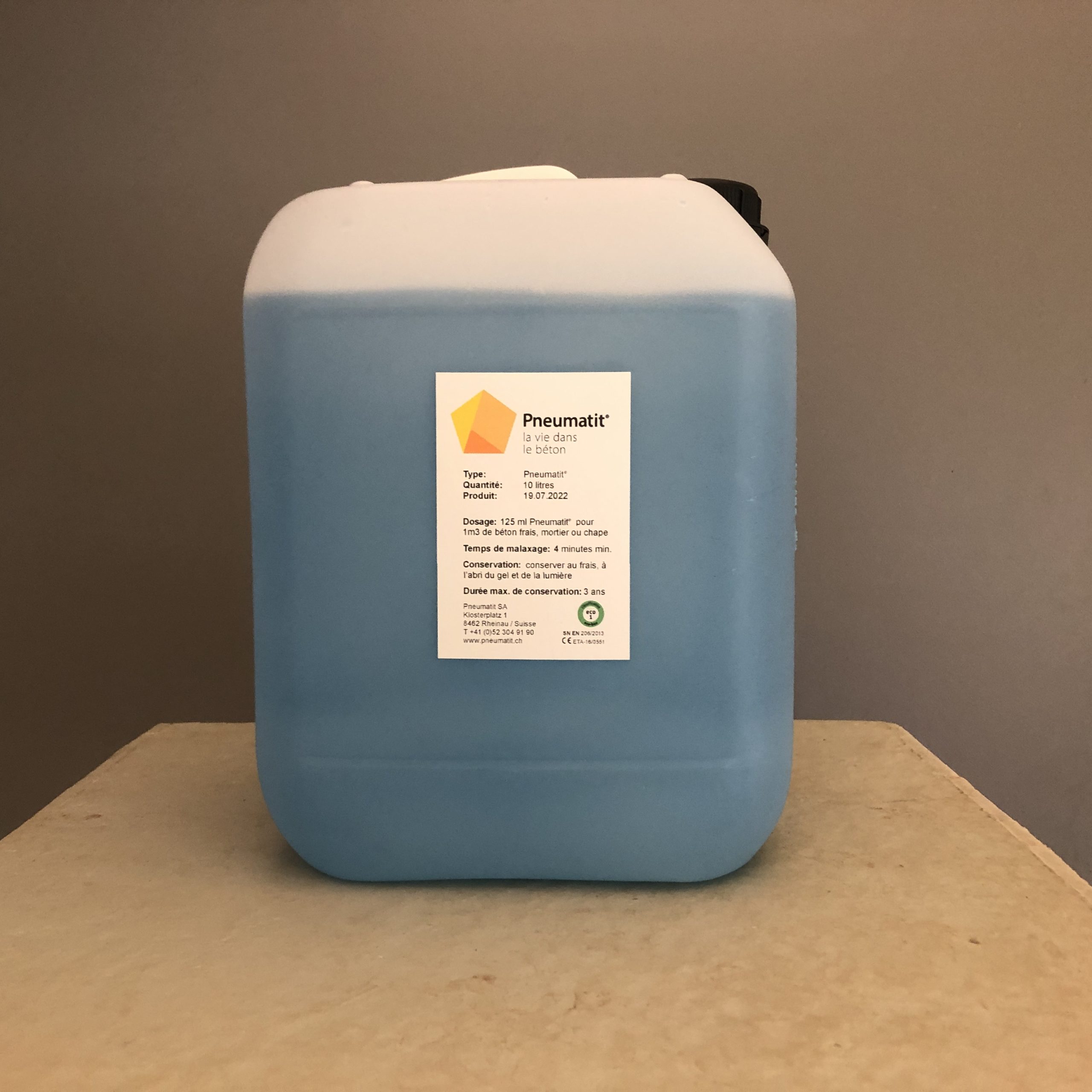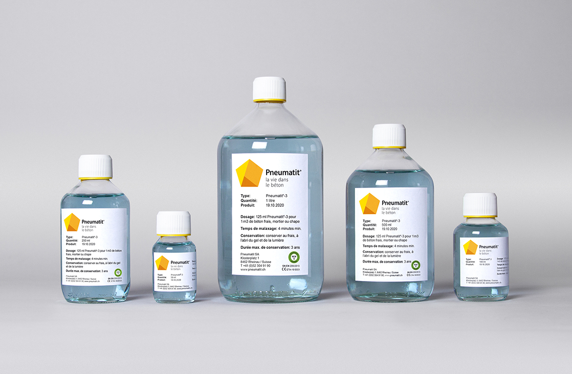 - 1 litre de Pneumatit® pour 8 m3 de béton frais ou 125 ml de Pneumatit® pour 1 m3 de béton frais
