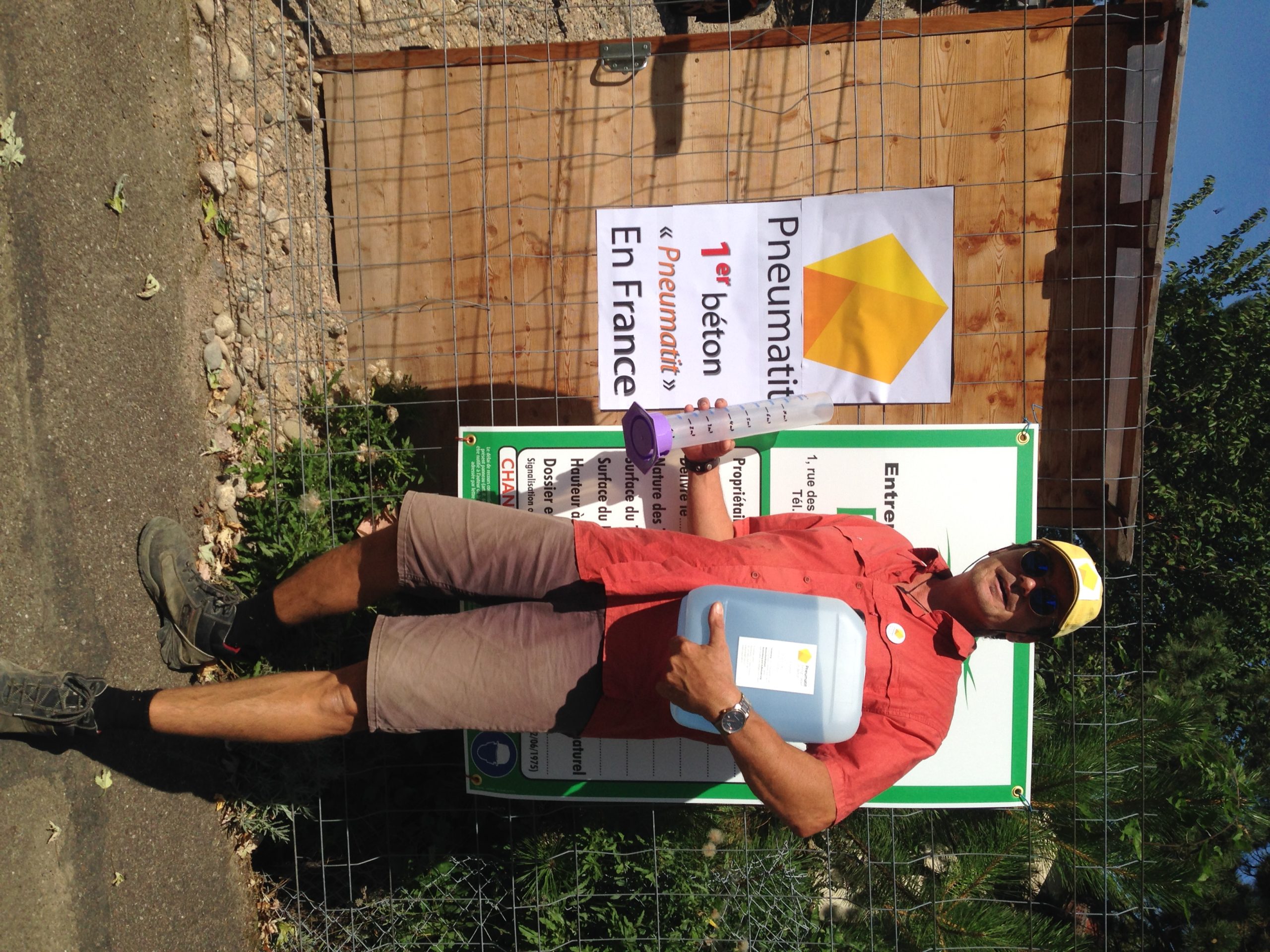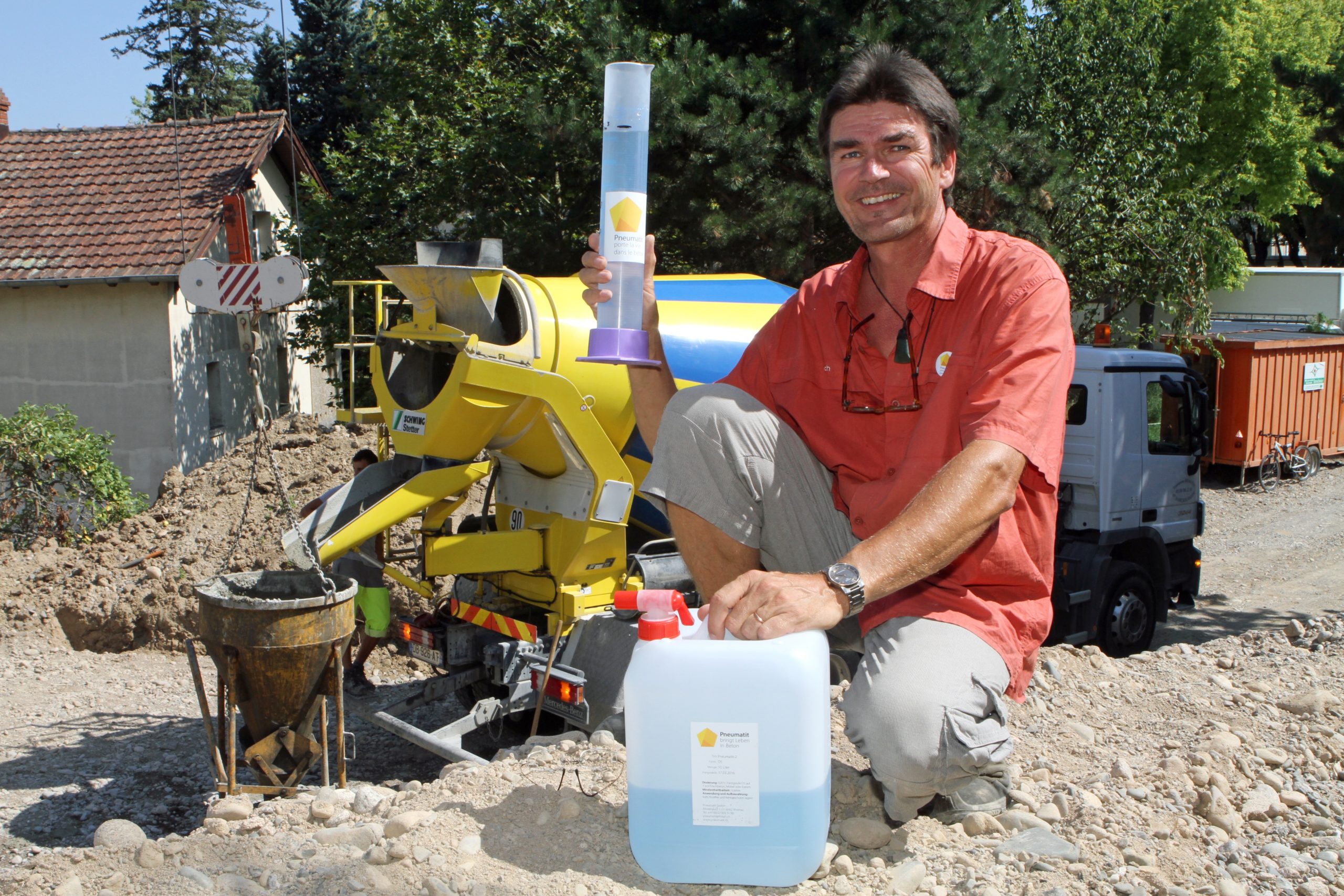 - Didier Gogniat reprÈsentant franÁais de la marque, prÈsente une dose de Pneumatit, un adjuvant issu de la biodynamie suisse, qui mÈlangÈ ‡ une toupie bÈton le rend plus vivant.